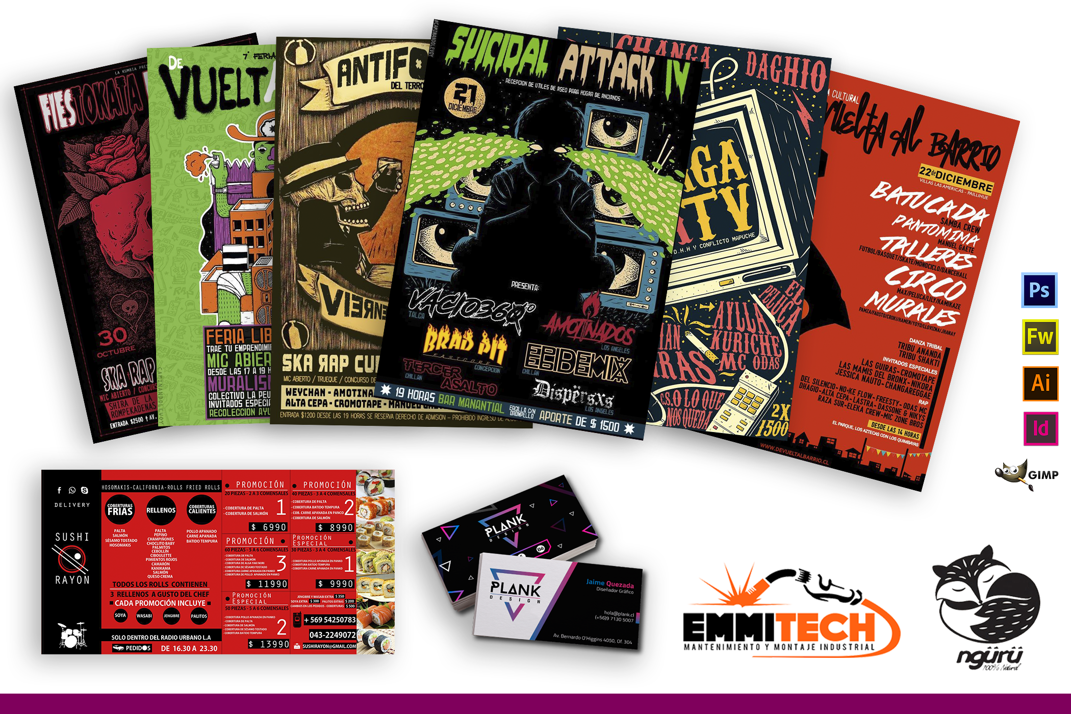 He hecho desde logos, carteles informativos, targetas de presentación, flayers eventos, caratulas discos etc. Imagen corporativa SushiRayon Rock & Rolls + logo compañia Emmitech , ente otros. Para ver mas diseños pincha aquí .